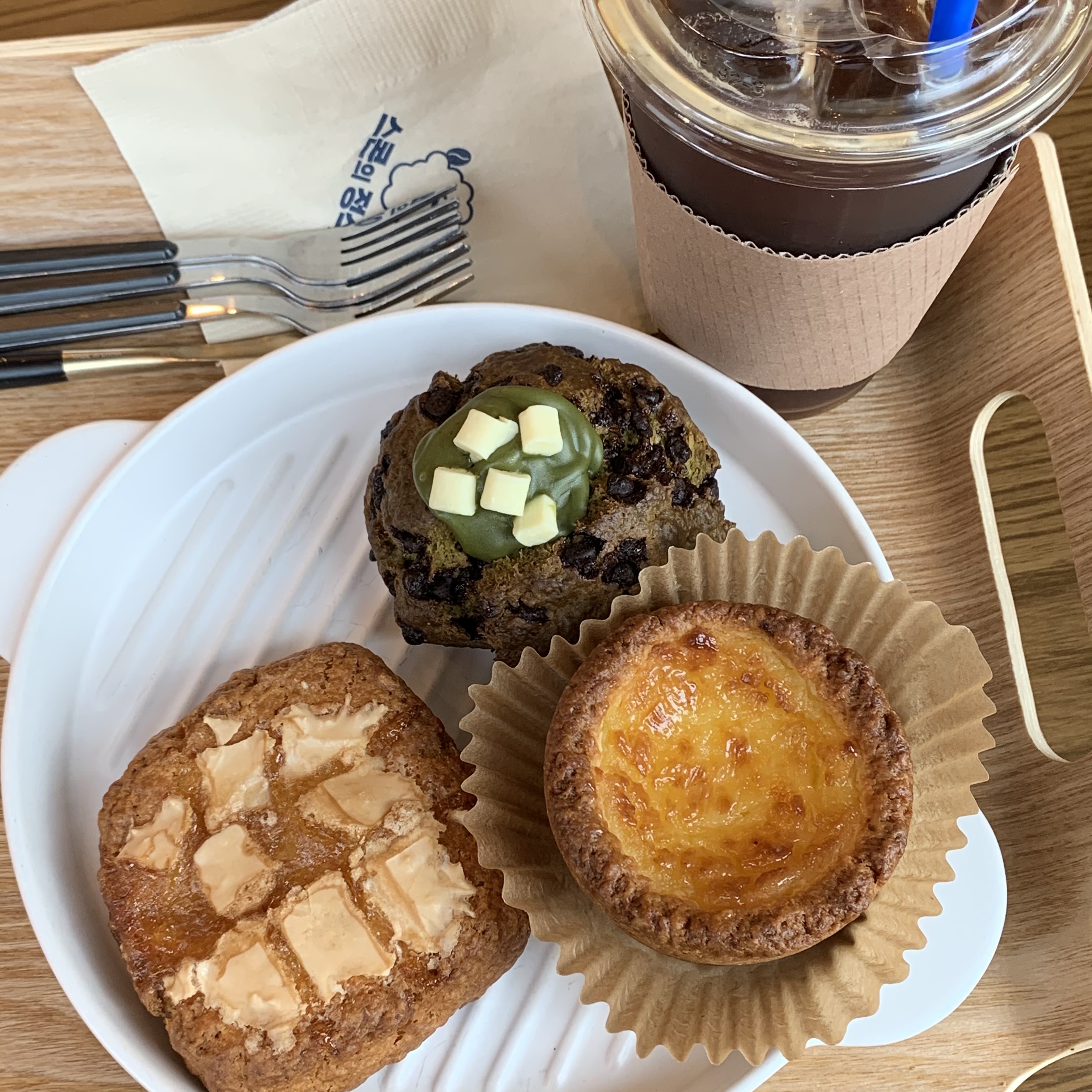 우리는 각자 초코 말차, 누네띠네, 에그 스콘을 주문했당.